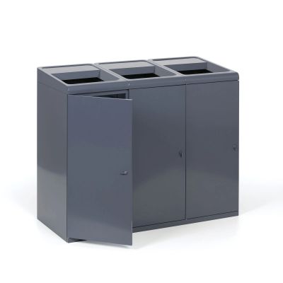 Tento odpadkový koš pro třídění odpadu je vhodný do obchodních center, gastro provozů, úřadů, hotelů, ale i nemocnic, škol či jiných veřejných prostor. Koš je zhotovený z pozinkované oceli, která je opatřena práškovým lakováním, což zaručí jeho pevnost a stabilitu, stejně tak jako dlouhou životnost. Přední dvířka jsou opatřena uzavíracím mechanismem. Součástí koše jsou tři vyjímatelné vnitřní nádoby z oceli, které jsou ošetřena šedým práškovým lakem.