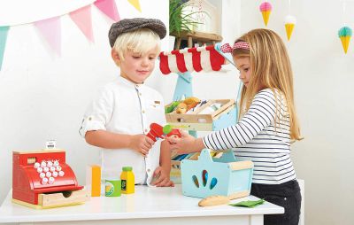 Dřevěný košík s různorodými dřevěnými potravinami a skenerem čárových kódů. Součástí balení jsou nálepky s čárovými kódy. Potraviny jako jsou tuňák, máslo, bageta, sušenky, kukuřice, kečup, olivový olej, špagety, čokoláda a cereálie, jsou plnohodnotným nákupem pro malé nakupující. Skvělá zábava pro hru na obchod, počítání a rozšíření komunikačních dovedností.