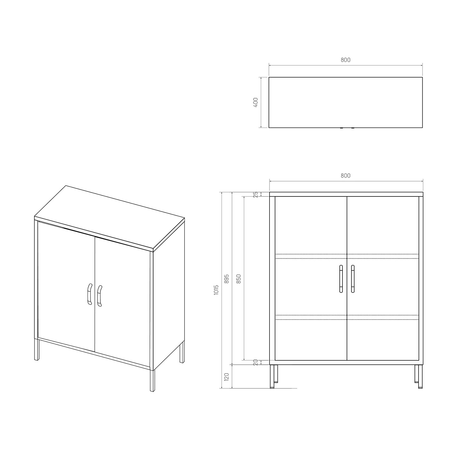 Spodní část kovové nízké skříňky s policemi je vybavena nastavitelnými nožičkami. Díky nim můžete skříň během několika okamžiků vyrovnat a eliminovat tak její nestabilitu, pokud je podlaha, na které má být umístěna, nerovná. Rozsah nastavení nožiček je 3 cm.