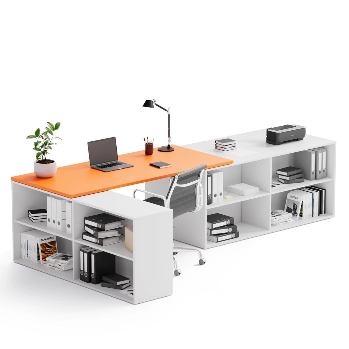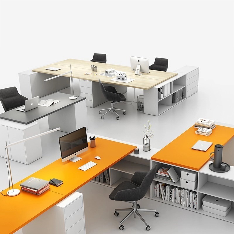 Stolové desky máme v naší nabídce ve třech barevných variantách – grafitová, oranžová a v dezénu přírodního dubu. Součástí sestav jsou kromě stolové desky také různé kombinace otevřených skříněk a kancelářských kontejnerů, které nabízí pestrý mix úložného prostoru.
