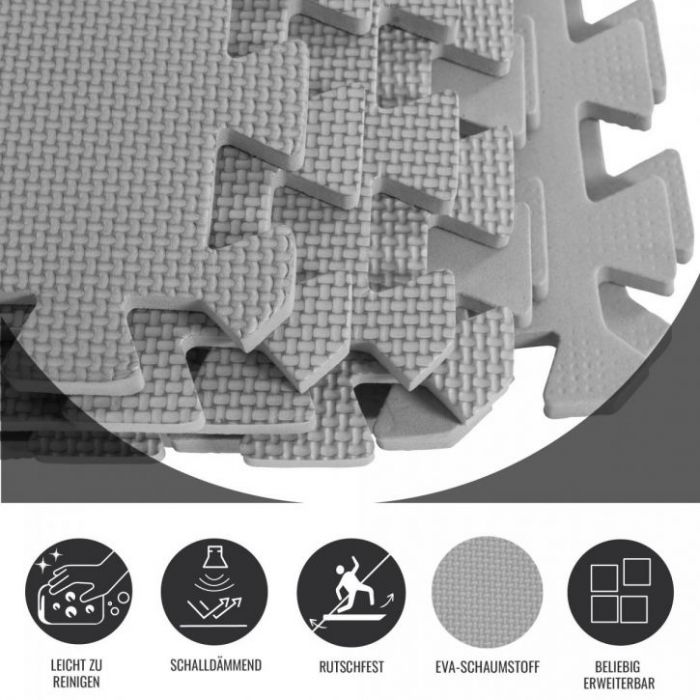 Čtvercové podložky lze spojit dohromady u zubů, zatímco koncové části doplňují celkový obraz. Povrchy podložek příjemné k pokožce se snadno čistí. Chrání podlahu před poškrábáním a promáčknutím od vybavení a činek a tlumí zvuky při tréninku. Podložky tvoří ideální základnu pro gymnastiku, pilates a jógu. S pěti různými barvami sad ochranných podložek můžete například navrhnout každou tréninkovou oblast v jiné barvě. Aby byla zajištěna bezpečná přeprava, jsou naše ochranné podložky zpracovány separačním prostředkem. Pokud je na povrchu olejový film, lze je jednoduše opláchnout čistou vodou a hadříkem. Prostředek není škodlivý. Důrazně nedoporučujeme používat k čištění podložek chemické prostředky, mohou způsobit změnu barvy povrchu.